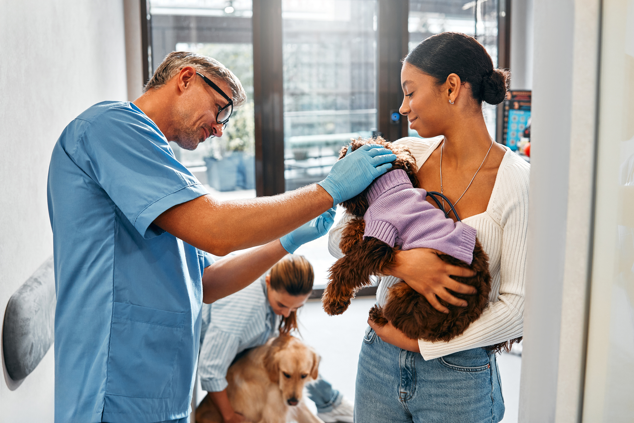 In the lobby of the veterinary clinic, dog owners came with their pets for a routine check-up and vaccination. A veterinarian strokes a poodle, which obediently sits in the arms of a woman.